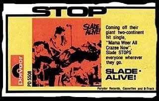 STOP LOOK LISTEN"Coming off their giant two-continent hit single 'Mama Weer All Crazee Now', Slade STOPS everyone wherever they go.SLADE-ALIVE! PD 5508"