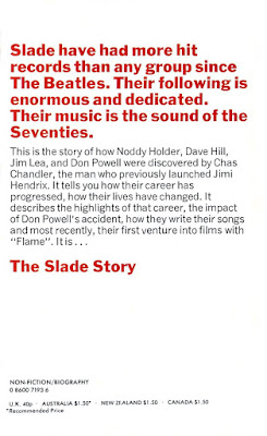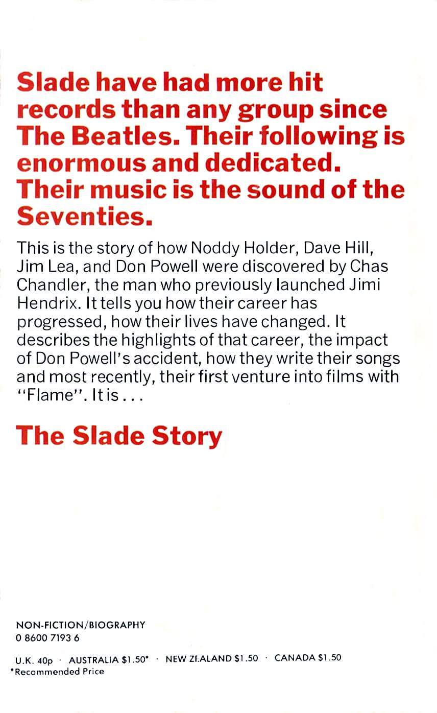 The cover is a good indicator, much of the content being a collection of music press interviews with some rushed research. Tremlett claims to have 'kept files on the group... since 1969' but his three year project is full of inaccuracies. It was, however, the first popular attempt at a biography on Slade, certainly the first in a book format to my knowledge, and is therefore worthy as a career landmark.